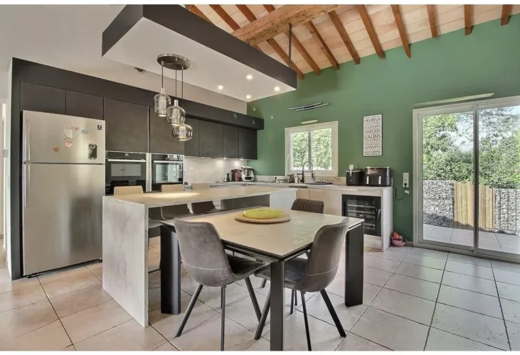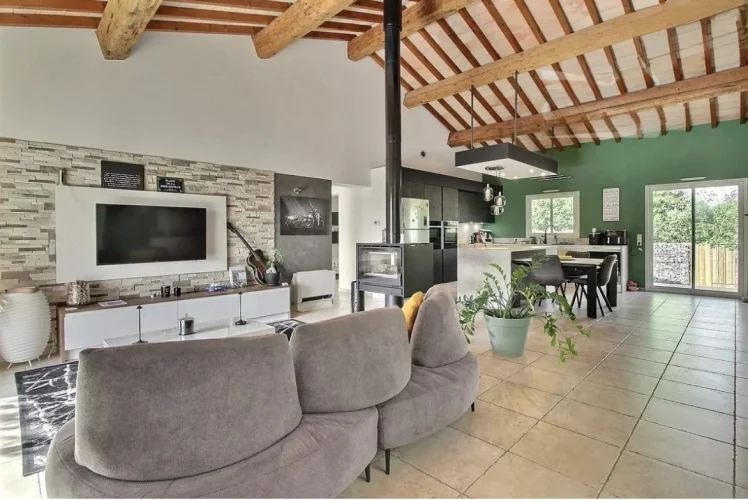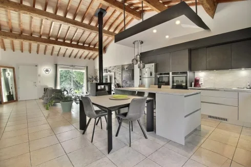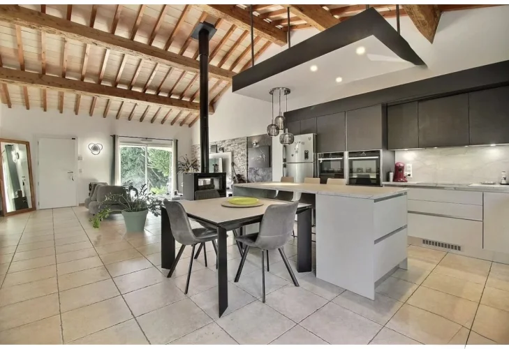 The entrance opens onto a spacious and light-filled open-plan living area, enhanced by impressive cathedral ceilings and large openings to the outside. The layout creates a natural flow between the living room, dining area, and the fully equipped modern kitchen, which features a central island ideal for everyday living and entertaining. A wood-burning stove adds warmth and character to the space.