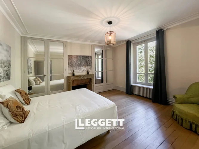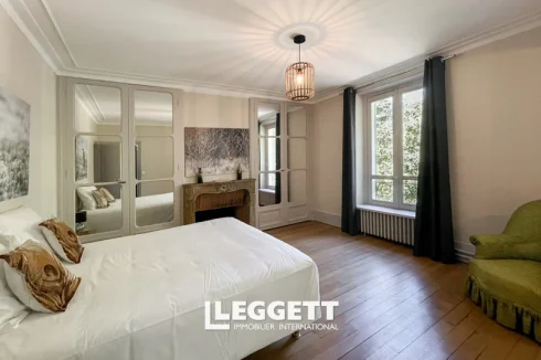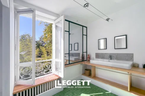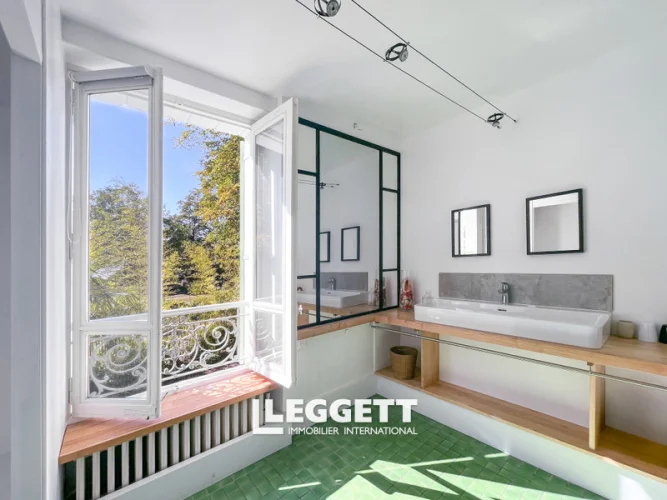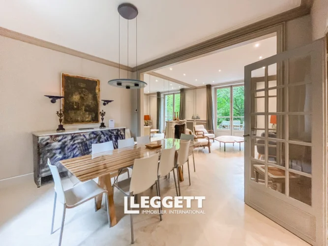 As soon as you enter, with its Belgian black marble and Saumur stone, you will be charmed by the character of the place. The vast 31.9 m² living room, bathed in light, features rare lemonwood and Madagascan violet wood parquet flooring, reflecting the owner's cabinetmaking skills. A 32.3 m² dining room and an 18.3 m² kitchen complete this reception area.