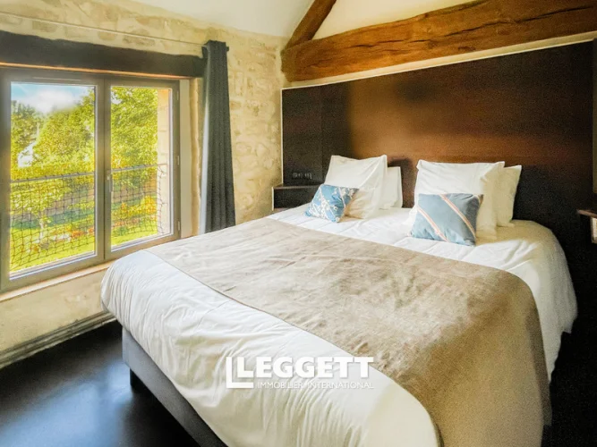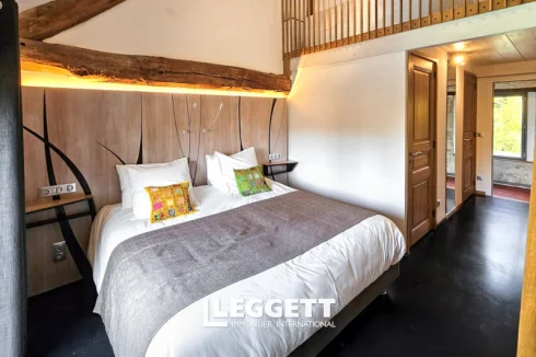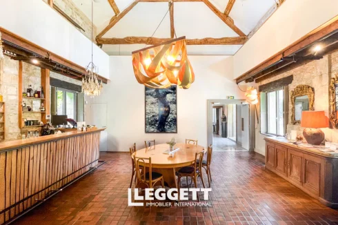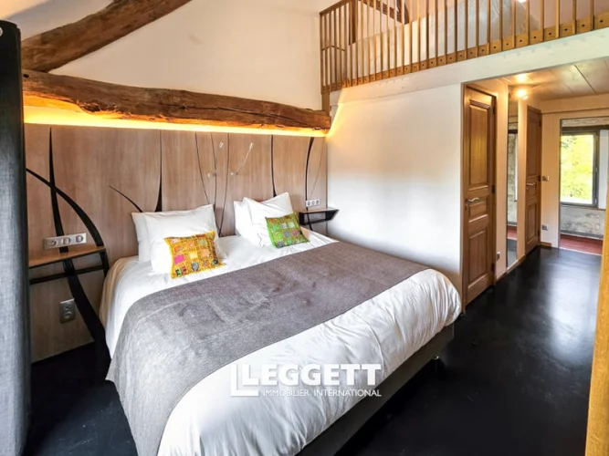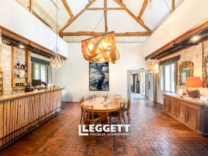 The 235 m² farmhouse is now equipped to welcome guests: on the ground floor, it has a large seminar room (49 m²), ideal for hosting receptions or professional events (20 to 25 people). A vast 48 m² dining room with surprisingly high ceilings, extended by an adjoining kitchen, completes this space (56m²). Upstairs, the sleeping area comprises three bedrooms ranging from 19 to 22m², including a large bedroom with a mezzanine for two additional beds.