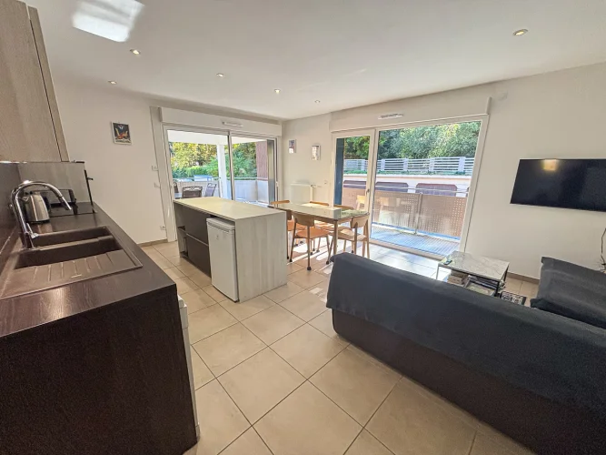 o Spacious living room with fully equipped open-plan kitchen, opening onto a balcony