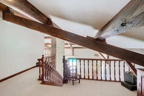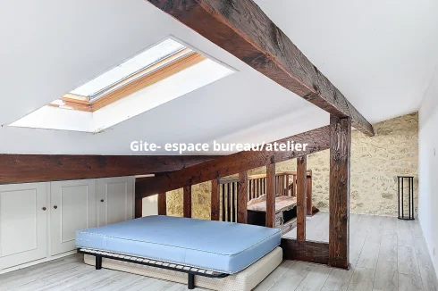 The guest house or gîte offers smaller but very comfortable rooms with, on the ground floor, a living room with an open-plan kitchen, two bedrooms and a bathroom; upstairs, a bedroom and a large space allowing the installation of a games room, an artist's studio, etc.