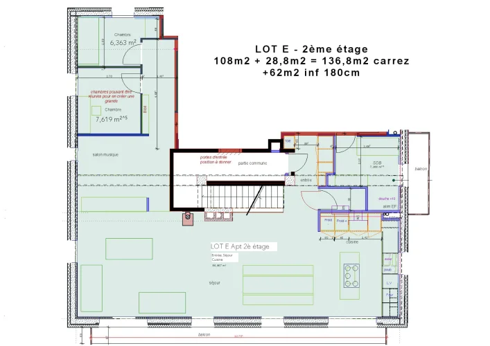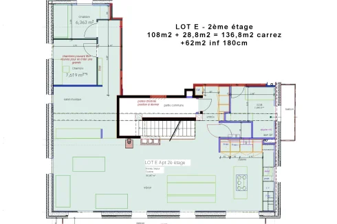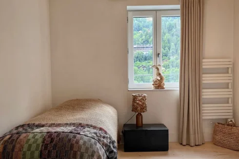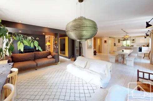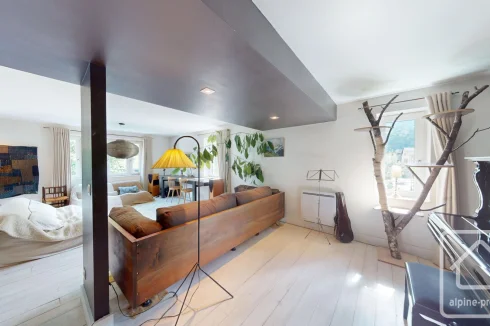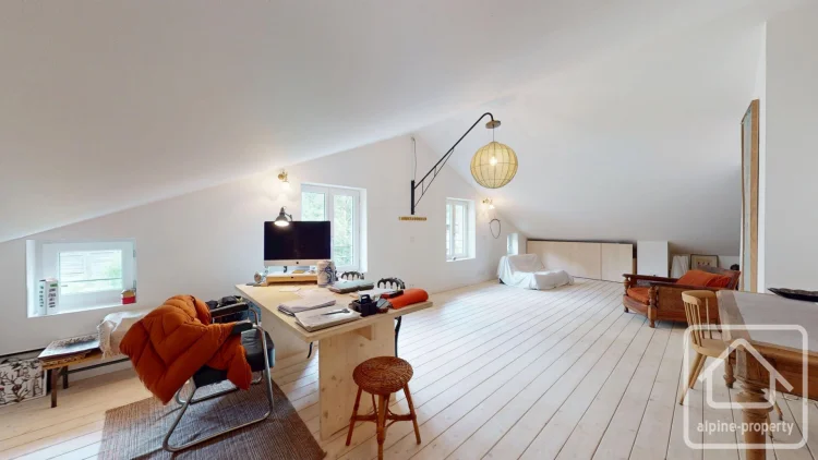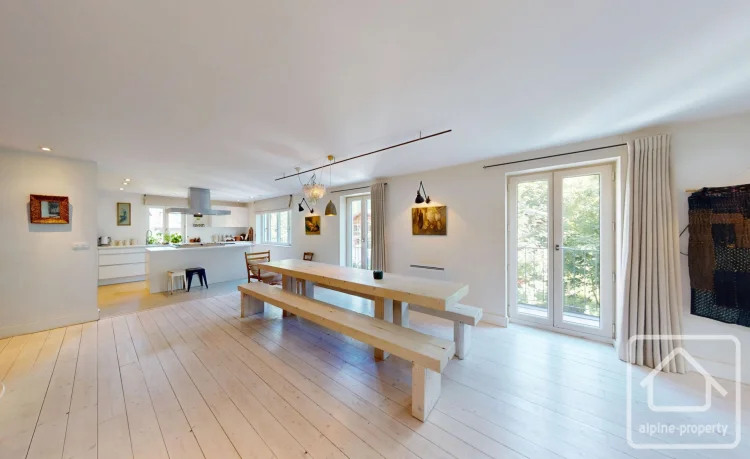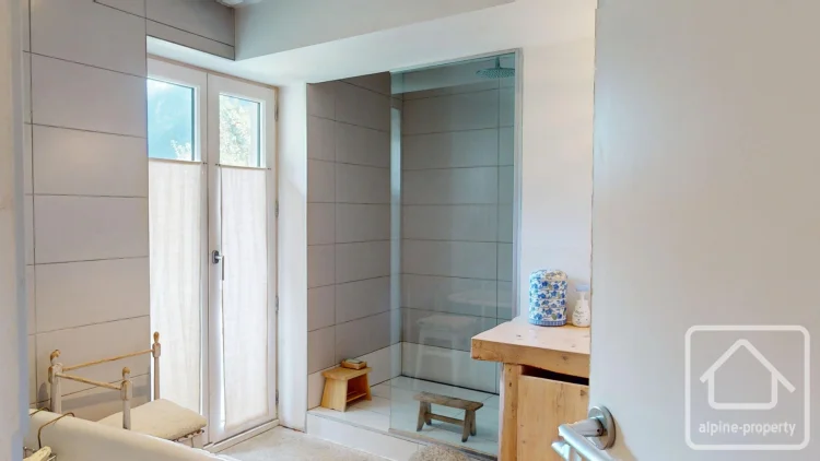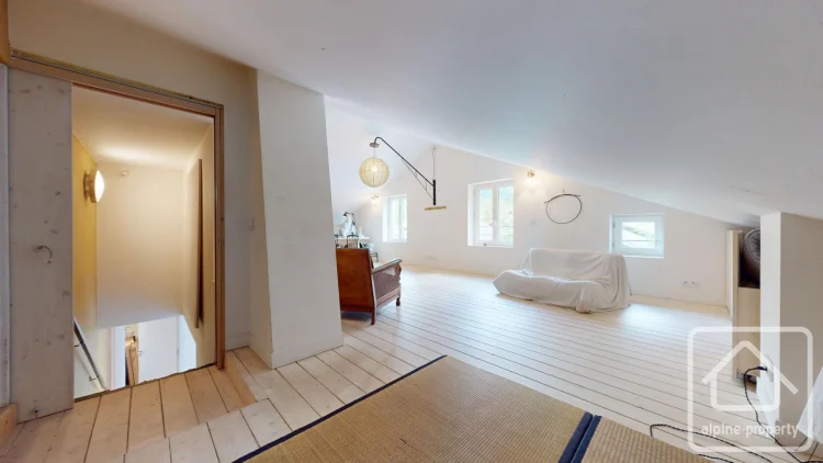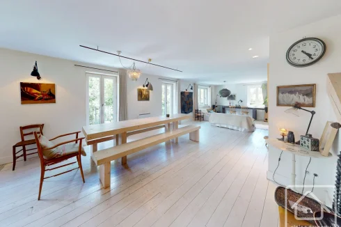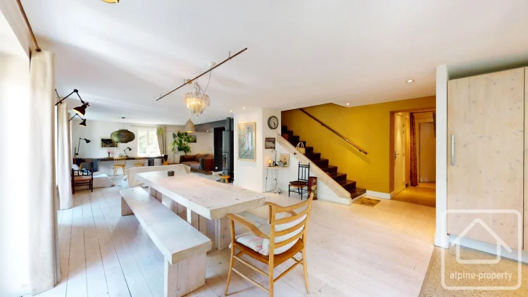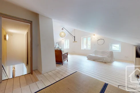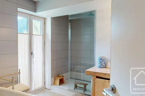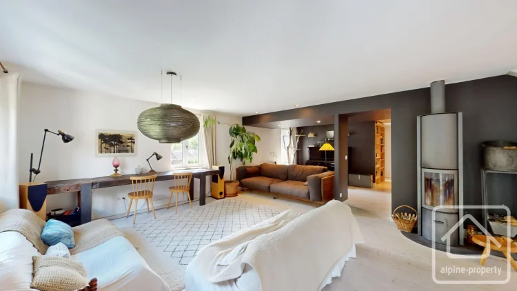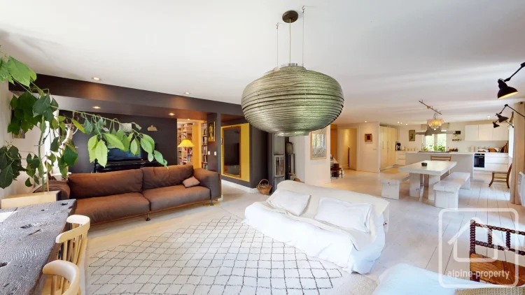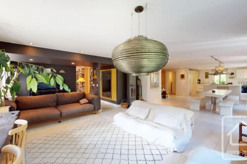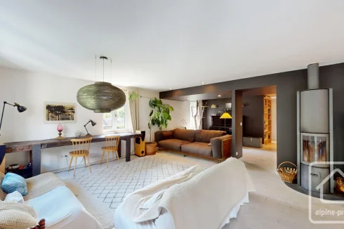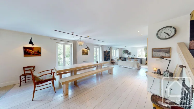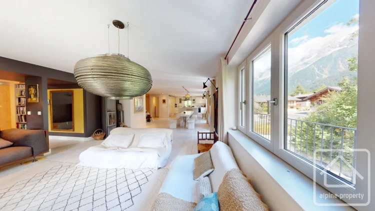 The magnificent and luminous kitchen/dining/living area totals 86.96m2, enjoys a triple orientation, oodles of light from the numerous windows and French doors, a warm atmosphere from the wood burning stove, and a south-facing balcony looking out on to the Mont Blanc massif.