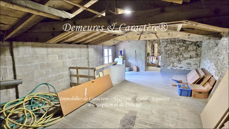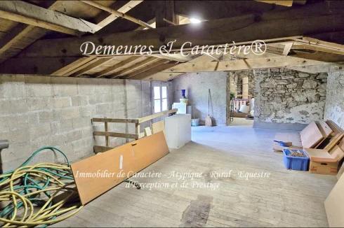 Secondary home, possible gîte (approx. 100m², 2 bedrooms) comprising on the ground floor a dual-aspect entrance with staircase, fitted kitchen with direct access to the terrace and garden, storage/boiler room, living/dining room with monumental fireplace. Upstairs: Landing and mezzanine office space, hallway, two bedrooms, vintage bathroom, toilet.