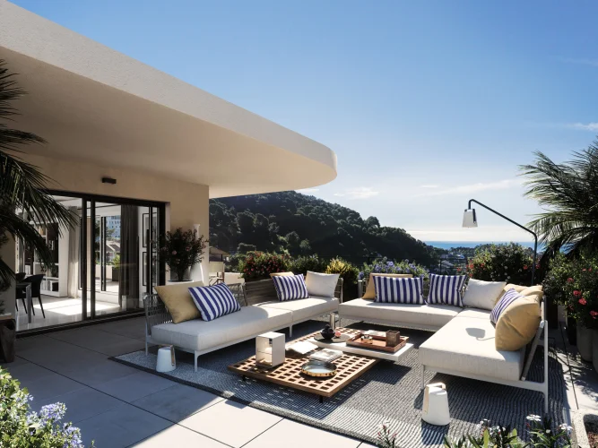 "BLUE RIVIERA" presents an array of exceptional apartments, ranging from studios to spacious 3 bedroom apartments, each boasting generous terraces. The development's sublime architecture offers breath-taking views of the village of Èze and the sparkling Mediterranean Sea.