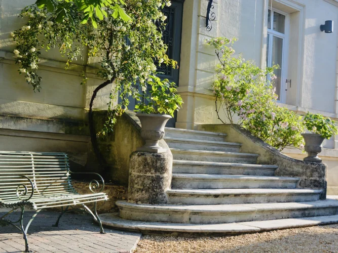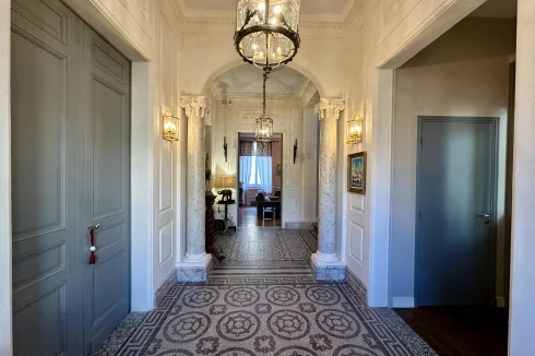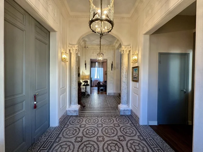 Sitting securely behind a walled perimeter on all sides, an elegant stone staircase leads through to an impressive entrance hall with period light fixtures and a flawless patterned stone floor.