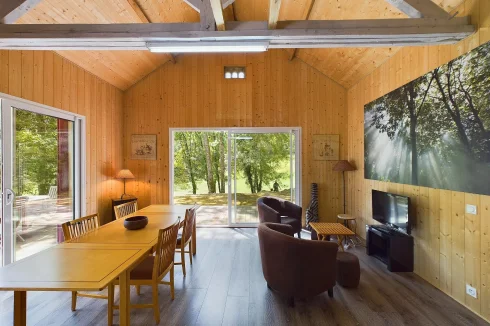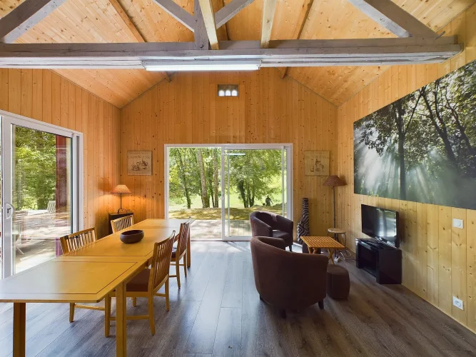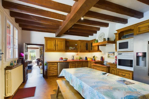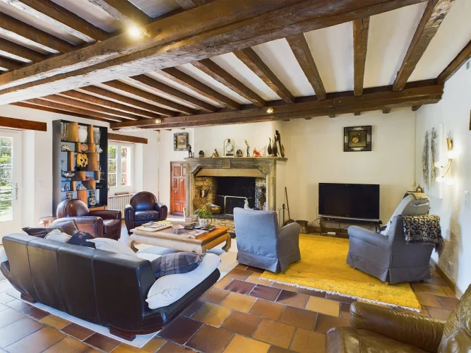 Across the garden, there is a second guest house with its own separate entrance, featuring a living room, an open-plan kitchen, a double bedroom, and a shower room. There is a mezzanine that could also be used as a children's bedroom. Sliding doors open onto a superb view of the wooded garden.