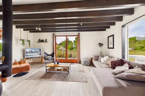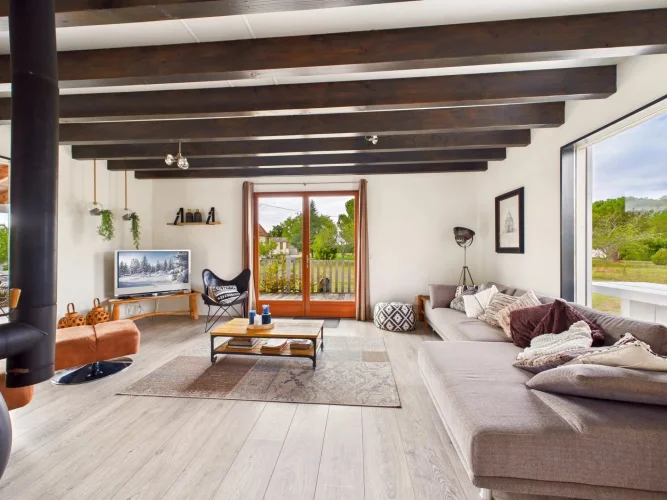 Each house is a mirror image of the other, featuring a warm wooden exterior, open-plan living spaces filled with natural light, and comfortable bedrooms ideal for families or groups. The interiors blend rustic charm with modern comfort, creating an inviting and relaxed atmosphere.