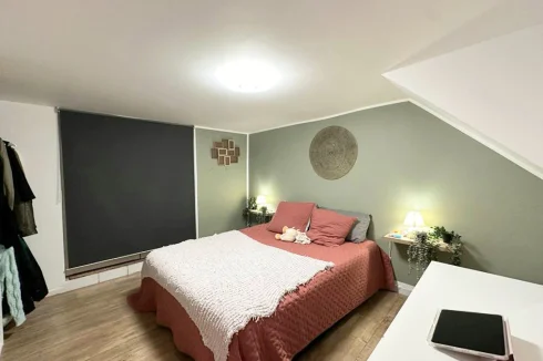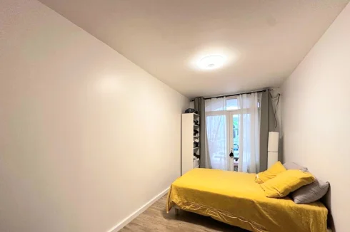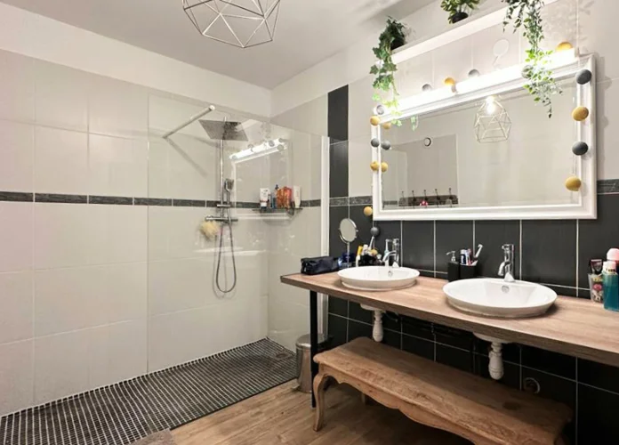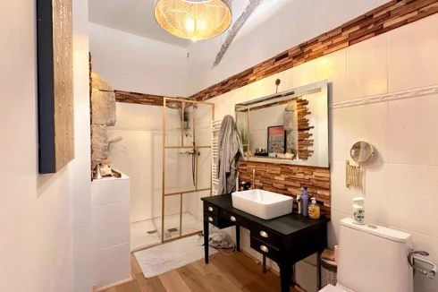 Ground floor: The building's common hall gives access to the hall of the flat. On the ground floor, you will find a spacious living room with fully-equipped open-kitchen (large central island and table, lots of storage space, integrated dishwasher, sink, induction hob and cupboards). Large bay windows give access to a most charming patio. Furthermore, 2 bedrooms, a master bedroom with en suite bathroom (shower, vanity unit, WC) and cupboard (old stone cellar), a WC, and a bathroom (shower, double washbasin unit).