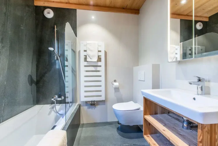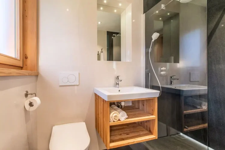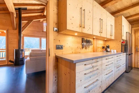The chalet benefits from very high ceilings particularly in the living room, exposed beams, large windows and a view of the surrounding mountains. It has been cleverly divided into two distinct parts, allowing you to live in one section while renting the other, or the flexibility to use the whole for rental or for a large family home.