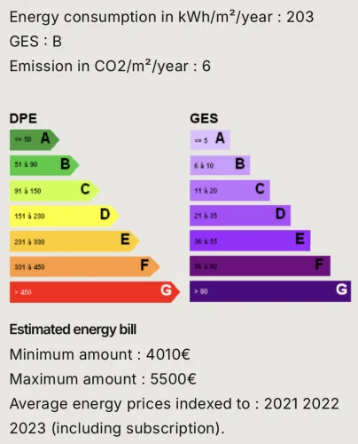 Estimated amount of annual energy consumption : between 4010 euros and 5500 euros per year. Average energy prices indexed from 2021 2022 2023 (including subscription).