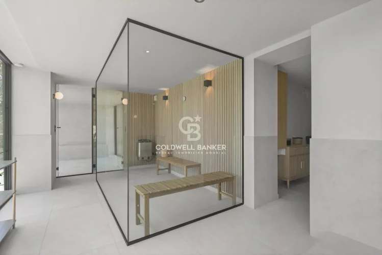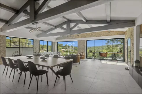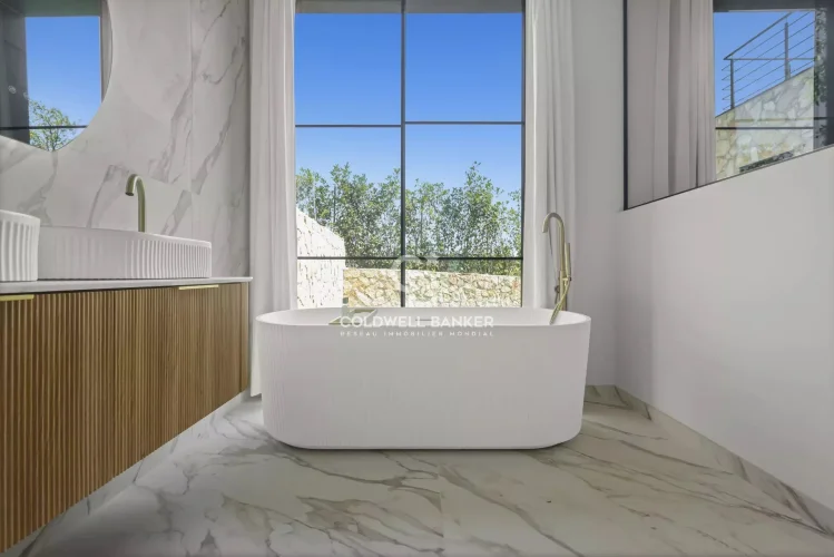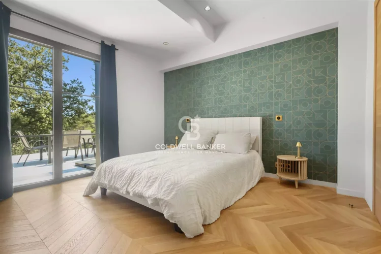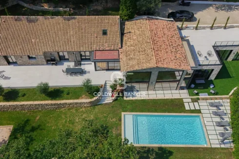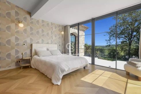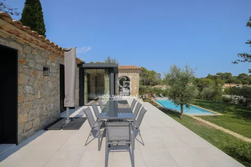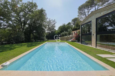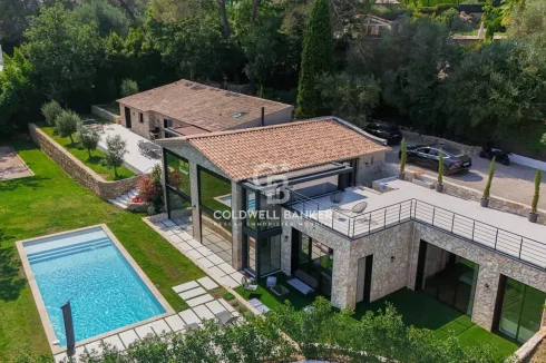 Pretty stone villa completely renovated located in a quiet area near the village of Valbonne. The house has an impressive living room with open kitchen, four bedrooms and three bathrooms/shower on the ground floor. On the garden level, the house also has a nice living room (converted into a screening room and billiard room), a fifth suite, a sauna and a hammam.