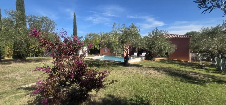 For sale in the commune of Bagard, contemporary architect-designed house in a quiet area with a living area of 145 m2 including a large fitted kitchen with dining area (25 m2), living room (27m2), 3 bedrooms including a master suite (27 m2), office, 2 shower rooms, 2 toilets, laundry room, dressing room, 2 terraces which communicate with the kitchen as well as the living room. Patio. Reversible air conditioning throughout the house. Central vacuum system. Garage (automatic gate) and carport. Enclosed and wooded land with an area of 1650 m2 with automatic gate. Swimming pool of 7.50 X 5.50. The house is connected to the sewer and fiber. Christophe Barthelot Tuc immobilier Alès Reference 3077 Price: EUR 425,000 (Fees payable by the seller)