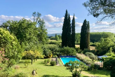 The 3,200 m² garden is largely fenced and includes mature trees, a variety of fruit trees, and quiet seating areas. A 10 x 5m heated swimming pool with pergola offers a pleasant space for relaxation and outdoor gatherings.