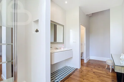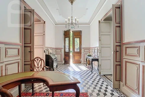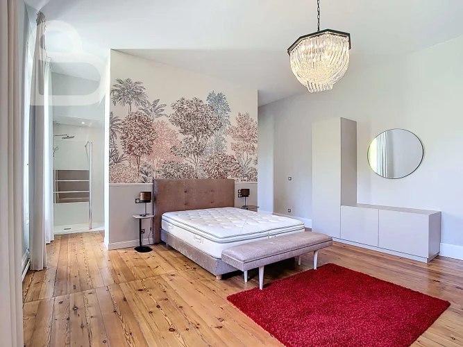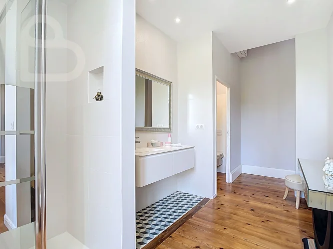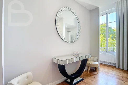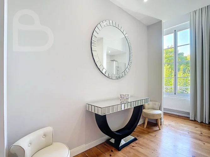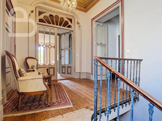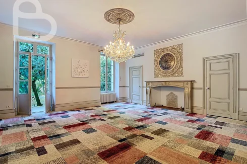 This stately home combines timeless charm with modern comfort. Behind the monumental white Bordeaux stone façade, you will discover a majestic entrance hall and three spacious salons on the ground floor, richly decorated with original features. Solid parquet flooring, fireplaces, authentic panelling, graphic-motif cement tiles, tall wooden windows and ornate ceilings bring the grandeur of the Belle Époque to life.