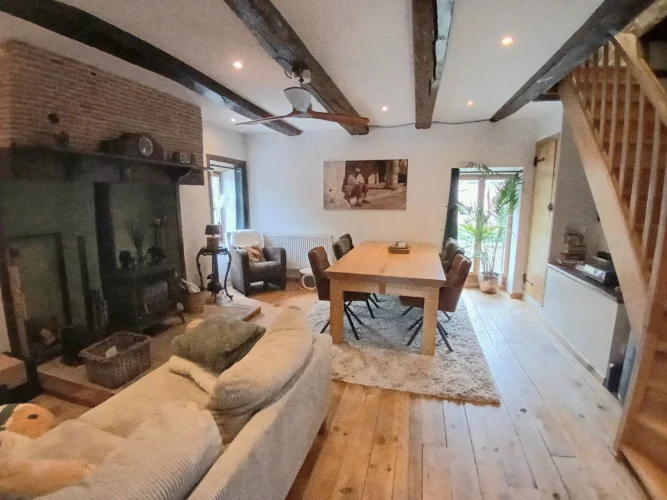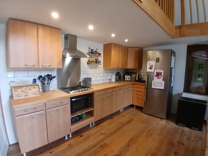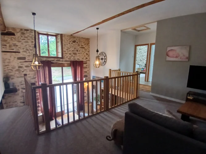 The second property has an open entrance drive. The front doors lead straight into the open plan living space. Originally a barn the ceilings are high. This area is open plan with a modern fitted kitchen. It's a good family space with stairs up to the mezzanine anda cosy seating area. There is a master bedroom with it's own bathroom and two further good sized bedrooms with en suite shower rooms. It is all newly installed. In addition is another bedroom with it's own shower room at ground level which can be reached from a hallway at the back of the open plan living area.There is an attached barn with a workshop.