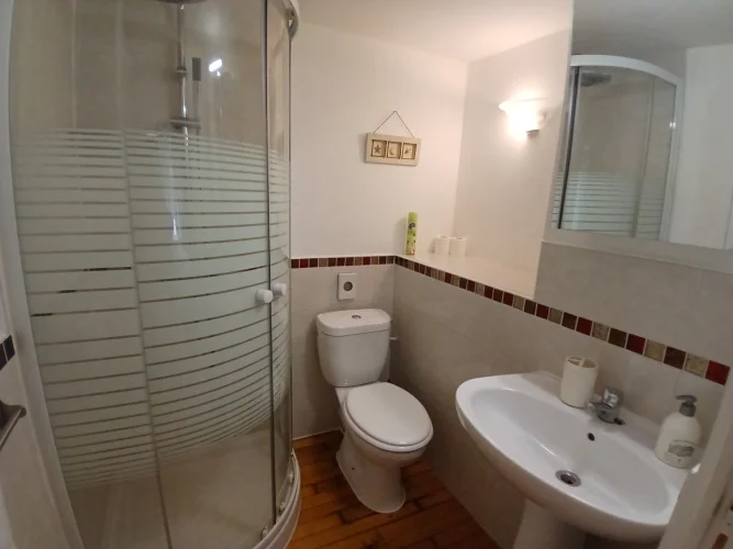 The first property has it's own separate entrance with electric gates, it's own garden and above ground pool.You enter the front door into open plan living space/kitchen with a wood burning fire. There are stairs up to the landing where you will find two bedrooms and two bathrooms.
