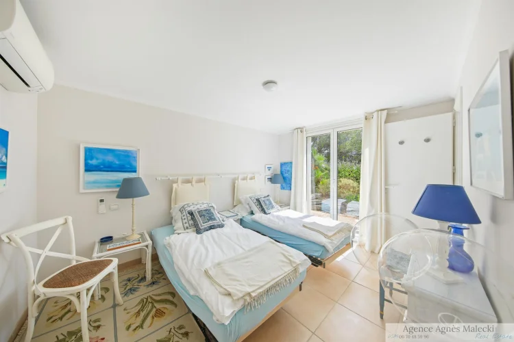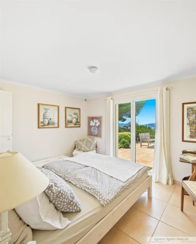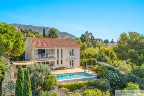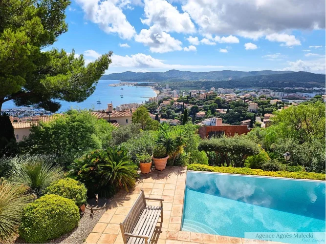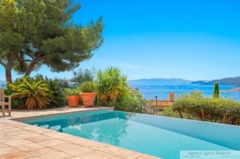 Exclusive To The Agnès Malecki Agency! Overlooking the Mediterranean, this Provençal villa embodies the art of living facing the sea. Here, each opening transforms into a living tableau, revealing the Îles d'Or, the port of Bormes, the legendary Cap Bénat, and the changing lights of Le Lavandou. Built on a 1,230 m2 plot of land planted with Mediterranean trees, the property offers 182 m2 of living space, designed to combine comfort and elegance. On the ground floor, the vast living room extends onto a terrace suspended 190o above the sea, a true belvedere overlooking the horizon. Two bedrooms with their private bathrooms and an office complete this level dedicated to serenity. The garden level, bathed in light, combines a convivial kitchen with a dining room opening onto a large terrace, ideal for summer evenings. Two bedrooms with bathrooms, a laundry room and a cellar provide functionality and comfort. Outside, the infinity pool follows the sea line, offering a feeling of infinity. The wide beaches invite you to relax, while the terraces come alive with the rhythm of the seasons. The landscaped garden, fully planted with trees, envelops the whole in a peaceful and refined atmosphere. A double garage, outdoor parking spaces, a turning area and reversible air conditioning complete the features of this turnkey villa, designed as a rare refuge where luxury combines with discretion. Exclusively With Agence Agnès Malecki! Overlooking the Mediterranean, this Provençal villa perfectly embodies the art of living by the sea. Here, every opening becomes a living canvas, revealing the Îles d'Or, the port of Bormes, the legendary Cap Bénat, and the ever-changing lights of Le Lavandou. Set on a 1,230 m2 plot with Mediterranean essences, the property offers 182 m2 of living space, designed to combine comfort and elegance. On the main level, the vast living area opens onto a 190o terrace suspended above the sea, a true belvedere over the horizon. Two bedrooms with their private bathrooms and an office complete this floor dedicated to serenity. On the garden level, bathed in natural light, a convivial kitchen with dining area opens onto a large terrace, perfect for summer evenings. Two additional bedrooms with bathrooms, a laundry room, and a cellar bring both functionality and comfort. Outdoors, the infinity pool merges seamlessly with the sea, offering a breathtaking sense of endlessness. Expansive lounge areas invite relaxation, while the terraces shift with the rhythm of the seasons. The landscaped garden, fully planted with trees, wraps the property in a refined and peaceful atmosphere. A double garage, outdoor parking spaces, a turnaround area, and reversible air conditioning complete the amenities of this turnkey villa, designed as a rare retreat where luxury meets discretion.
