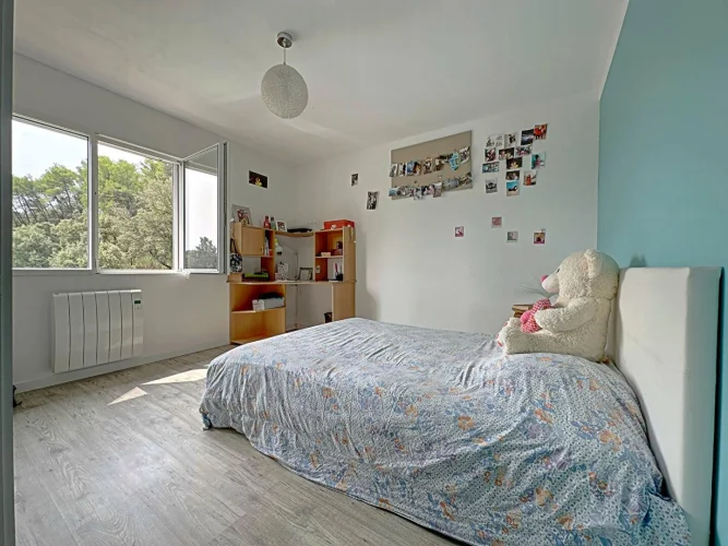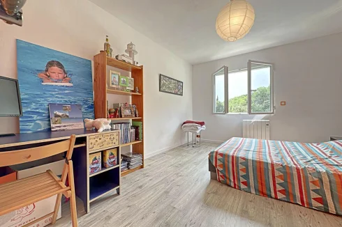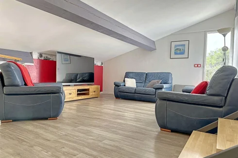 Upstairs, three bedrooms, one of which is generous of 25 m2, a TV lounge opening onto a solarium, and a bathroom complete the sleeping area.