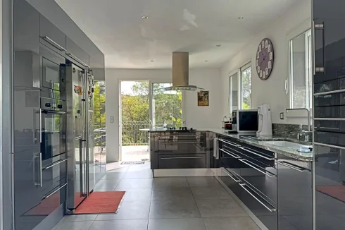 From the entrance, a large hall leads to a spacious living room bathed in light, extended by a modern semi-open kitchen with direct access to the outside. The ground floor also has two bedrooms, including a beautiful master suite, as well as an office.