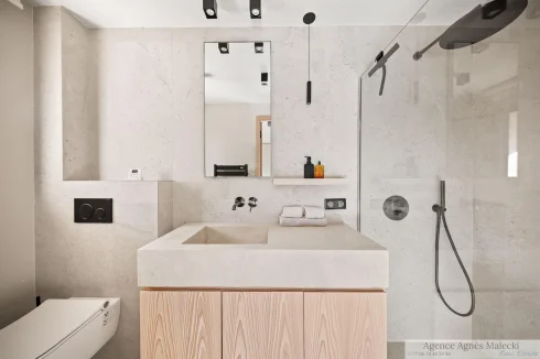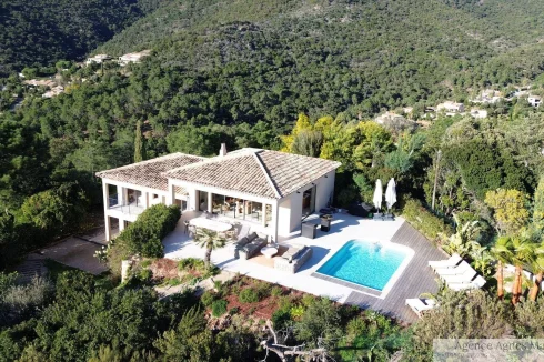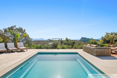 Agnes Malecki Agency - Le Rayol Canadel Prestige for this Very High-End Property of 187m2 living space + 50m2 garage With Its Sea View In A Very Residential Area In Very Quiet - Exceptional Property entirely renovated with high-end materials, located on a plot of land planted with Mediterranean species of more than 1500 m2. Built on 2 levels, this Property offers on the ground floor Double garage, 03 en-suite bedrooms, laundry room. Upstairs, you will find a living room of 70m2, custom-made American kitchen with access to the swimming pool and terrace of 200m2 Sea View, 03 bedrooms with its bathrooms and toilets. 5 parking spaces outside the garage. Air conditioning in all rooms, custom-made layout. Close To The Beach!
