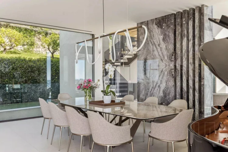 Every detail of the villa has been meticulously crafted, with sleek architectural lines and expansive floor-to-ceiling windows that dissolve the boundaries between interior and exterior. Natural light floods the living spaces, creating a seamless connection with the breathtaking surroundings. The interior design, entrusted to Cochet Pais, evokes timeless sophistication with bespoke finishes, refined materials and cutting-edge home automation throughout, ensuring a lifestyle of effortless modernity.