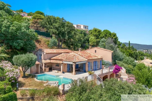 Co Exclusive - Boasting breathtaking views from Cap Lardier to Pointe du Dattier, to the Levant and Port-Cros islands, the property sits on a landscaped plot of 1905 m2 and is located on the heights of Cavalaire in a sought-after area. Close to Bonporteau beach and the town center, in a quiet setting, the house, built in 1989 by the current owner, is spread over several levels. It is composed of two wings separated by an entrance with a striking sea view. The first wing, dedicated to the living areas, consists of a living room with a fireplace, a dining room, a kitchen, and a small office-bedroom, opening onto a very large terrace with a swimming pool. On the lower floor, a bathroom and a large office that can be transformed into a bedroom open onto a large terrace. The second, dedicated to the sleeping area, is composed of two bedrooms, a bathroom, a dressing room and on the lower floor, a storeroom as well as a studio opening onto a terrace. The panoramic sea view is omnipresent from all the rooms. A swimming pool area, a vegetable garden, workshops and a garage complete the ensemble.