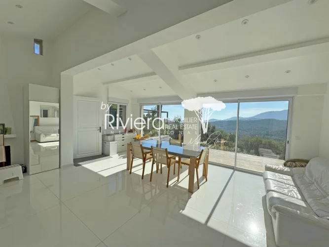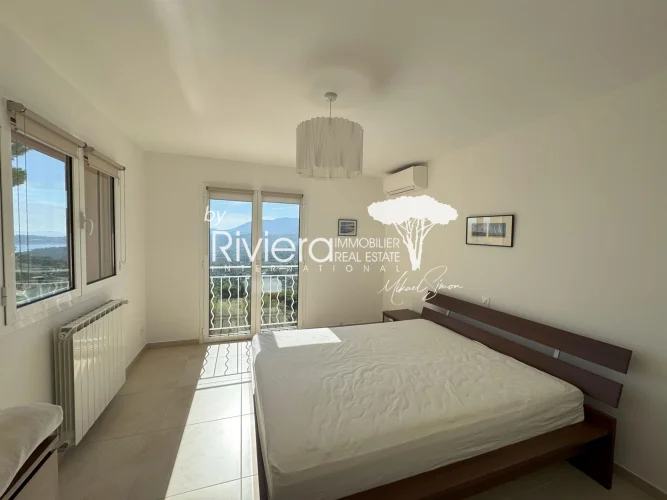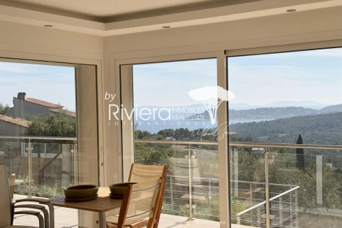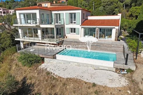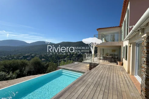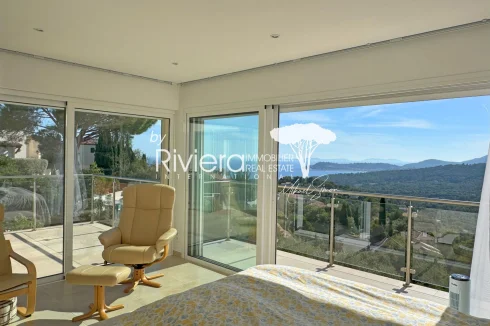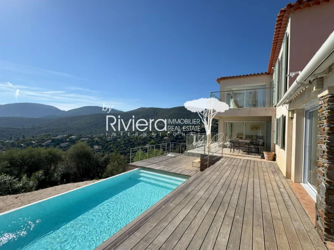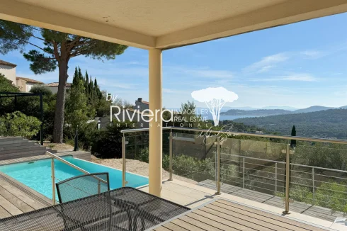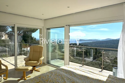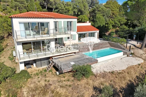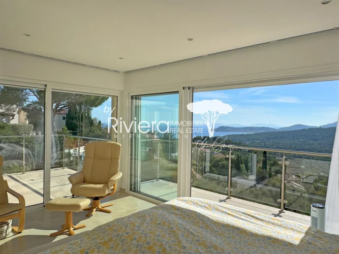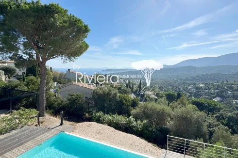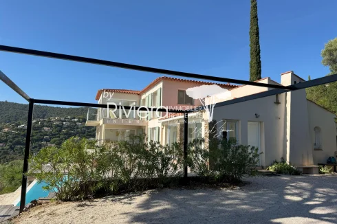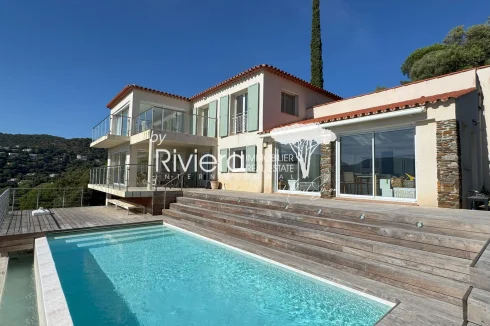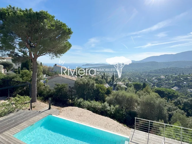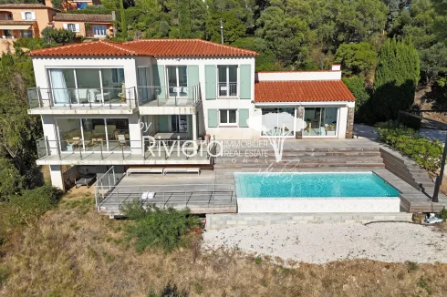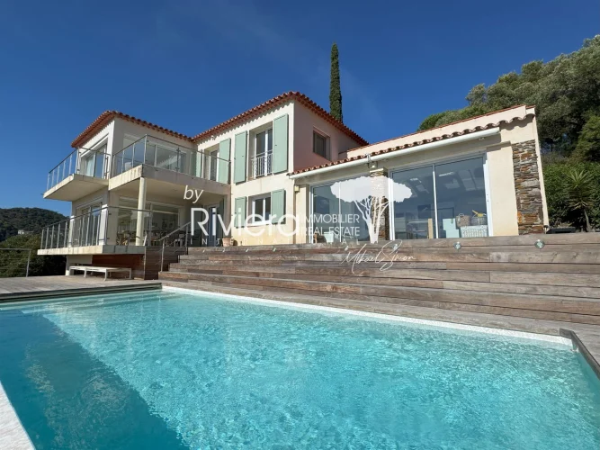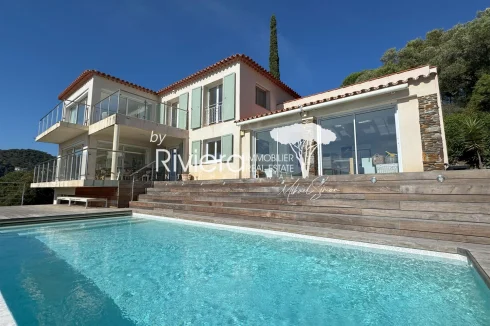 In a quiet and sought-after area of La Croix-Valmer, property of approximately 200m2 located on a plot of 1,500m2 with Sea View on the Golden Islands and South exposure! It offers on the garden level a large dining room with an equipped American kitchen opening onto a beautiful terrace, a large air-conditioned living room with a covered terrace, two bedrooms, a shower room and a laundry room. Upstairs, a very large air-conditioned master bedroom with bathroom, shower, bathtub, toilet, dressing room and private terrace, two other bedrooms sharing a shower room with toilet. The swimming pool area (equipped with a roller shutter) made of exotic wood ensures a summer atmosphere! Very beautiful sea view - Dominant position - Completely renovated - Reversible air conditioning...Garage and Carport.