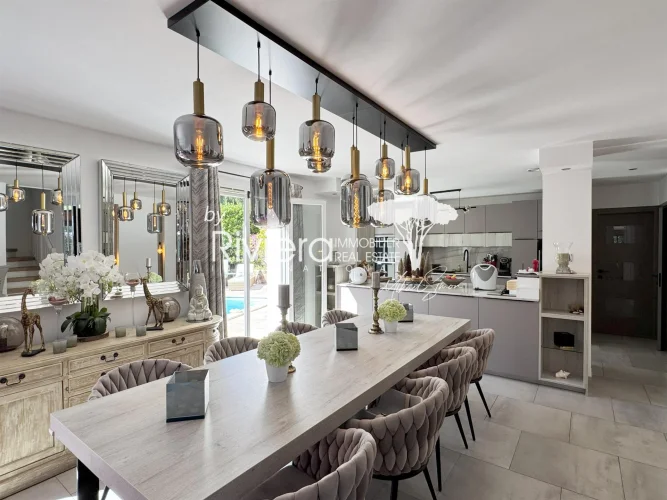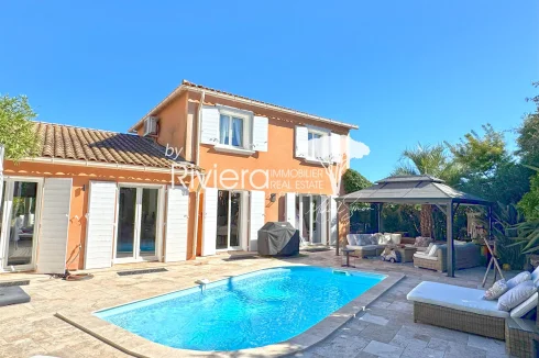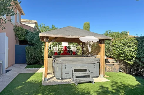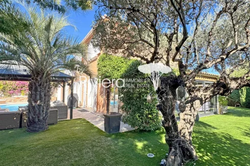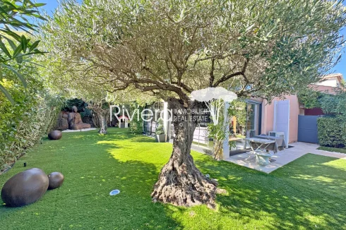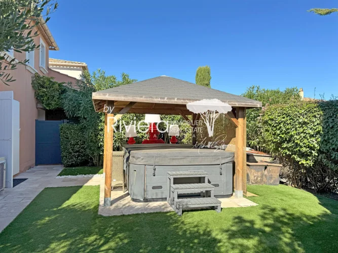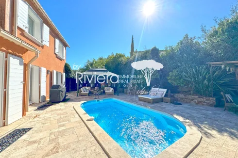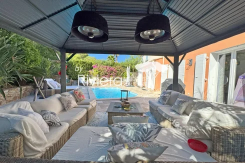 In a gated residential estate, modern villa of approximately 160m2 in neo-Provençal style in perfect condition, comprising an entrance hall, large double living/dining room with fitted American kitchen, 4 bedrooms (1 on the ground floor and 3 upstairs), 3 shower rooms! Enjoying a beautiful South/West exposure and superb exteriors, it offers large terraces around the swimming pool, covered Gazebo-type terraces and covered jacuzzi! Small garage - Two private parking spaces! Landscaped garden! Walking diatance to the Village of Croix-Valmer !