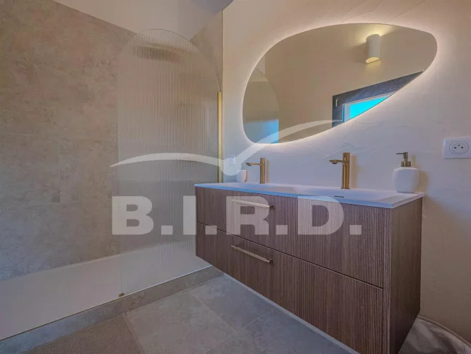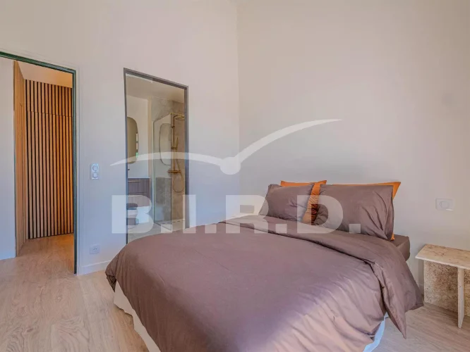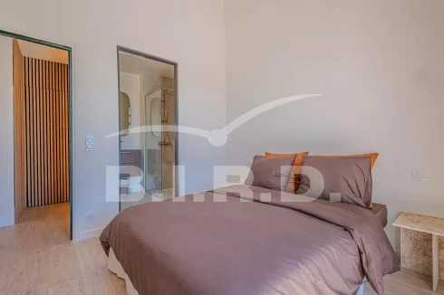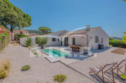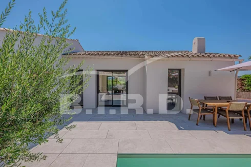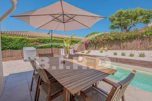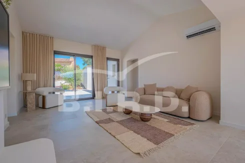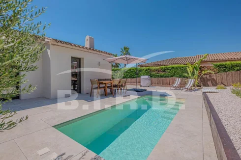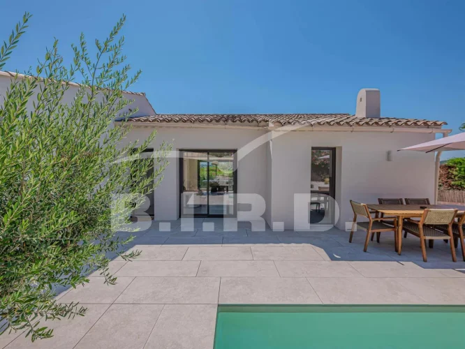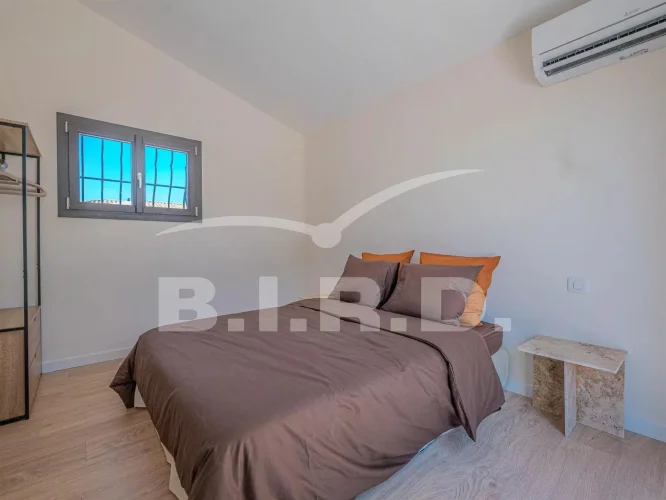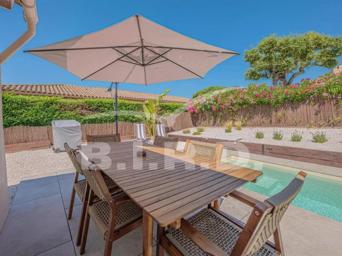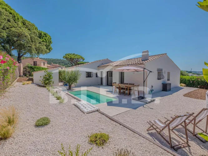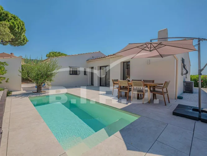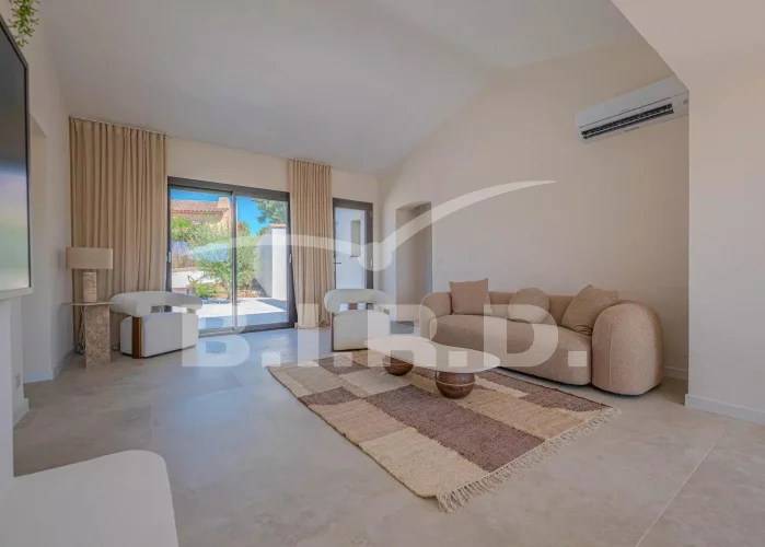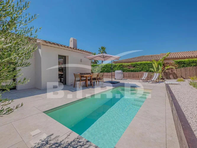 Nestled in the picturesque setting of Sainte-Maxime, this charming villa offers a unique combination of modern comfort and serene outdoor living. With a living area of 88.86 m², the property features three beautifully furnished bedrooms and four versatile rooms designed for both relaxation and entertainment. The villa is equipped with air-conditioning and modern sliding aluminum windows, providing both style and energy efficiency. Double glazing throughout ensures peace and quiet, enhancing your living experience.