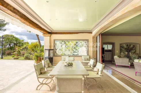 Outdoors, the stunning pool area opens toward panoramic views of the sea and surrounding greenery. The long infinity pool is complemented by a generous pool house offering a games room with billiards, a lounge and bar area, as well as a full spa — creating the ultimate space for relaxation and entertaining. Facing south and southwest, the property enjoys optimal sunlight throughout the day. Perfectly positioned at the end of a quiet cul-de-sac, it ensures complete peace and security while remaining just minutes from the centre of Cannes and its beaches.