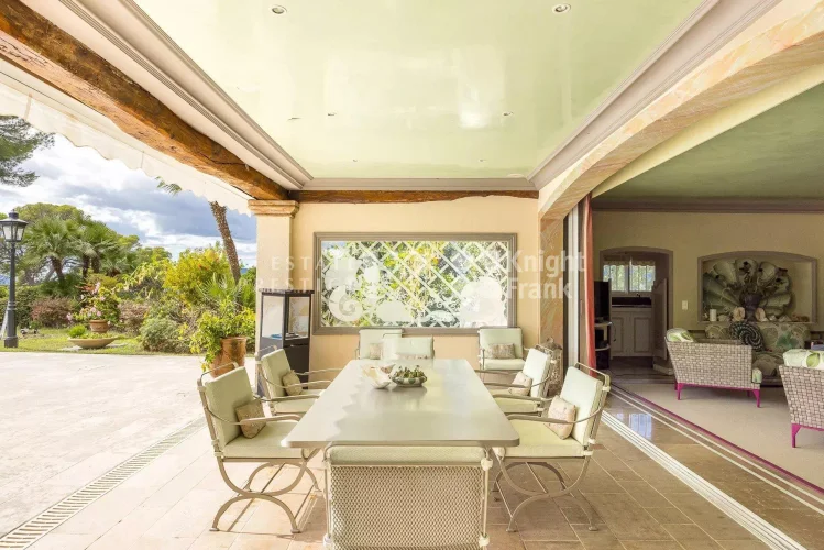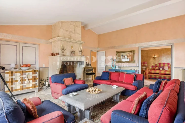 The main villa exudes classic Riviera elegance and comprises two luxurious master bedrooms, a staff apartment integrated into the main residence, a grand entrance hall, and expansive living and dining areas. A large, fully equipped kitchen designed for professional or family use, along with a stylish bar and entertainment space, complete the convivial living environment.