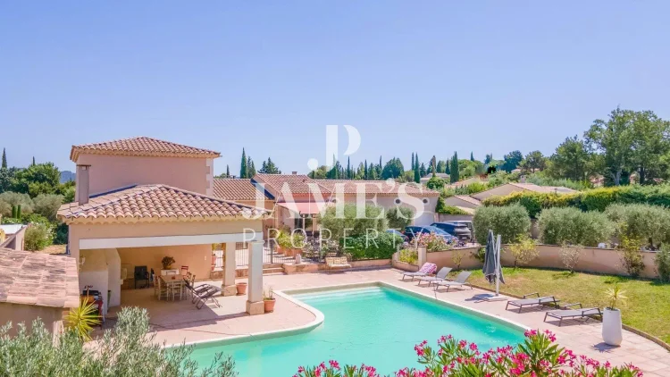Outside, the walled and landscaped garden with automatic irrigation offers a peaceful retreat. It features a large rounded swimming pool (approx. 18 X 6 M, chlorine, recently refinished gel-coat), a charming pool house with fireplace, two ovens (including a pizza oven), a shower, and Wc — ideal for enjoying the summer months.