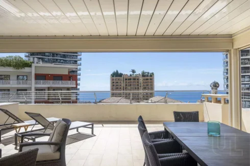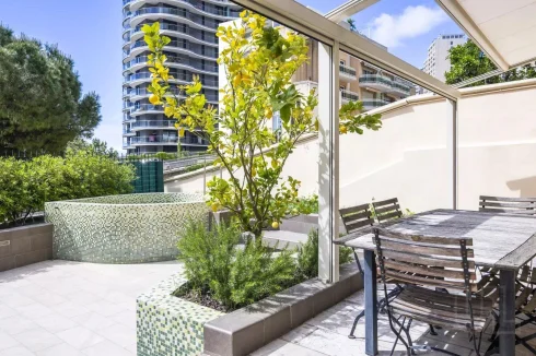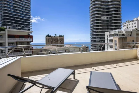 The upper floor is dedicated to light filled living and entertaining spaces. The main reception room, kitchen, and office flow seamlessly and open onto a spacious terrace with a pergola, from which one can enjoy panoramic views of the sea and the glittering principality of Monaco. This idyllic setting is perfect for alfresco dining and leisurely summer evenings.