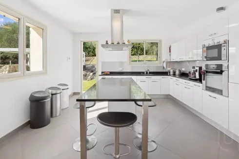 The interior offers generous and light-filled living spaces, with a contemporary kitchen complete with a wine cellar and a sumptuous master suite featuring its own jacuzzi. The lower level of the villa is dedicated to leisure and entertainment, with a private cinema, billiards room, and bar area, creating the ideal setting for hosting family and friends.