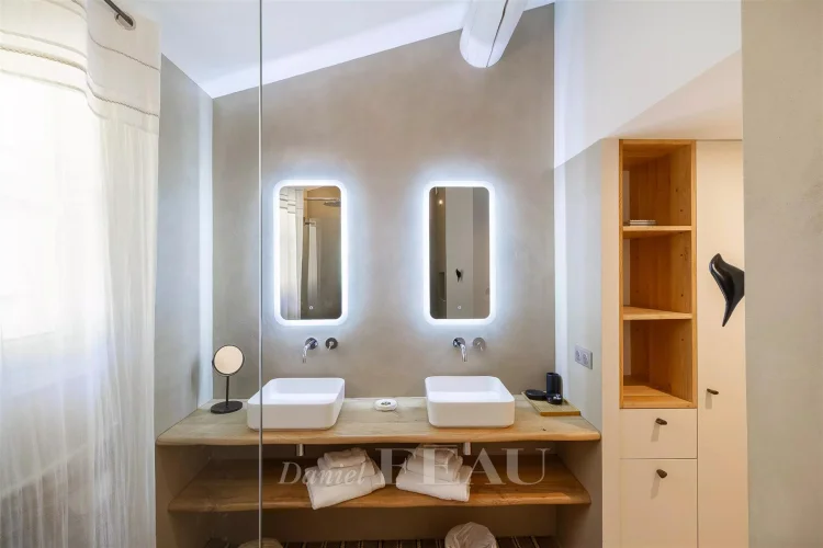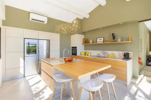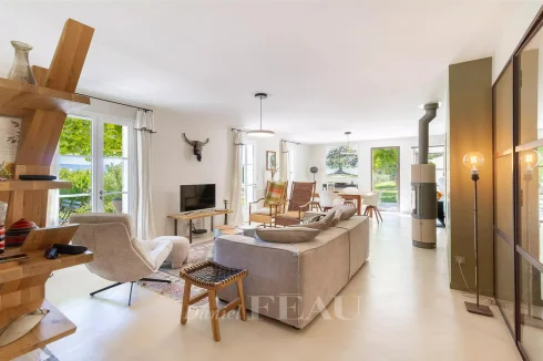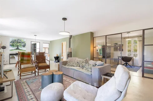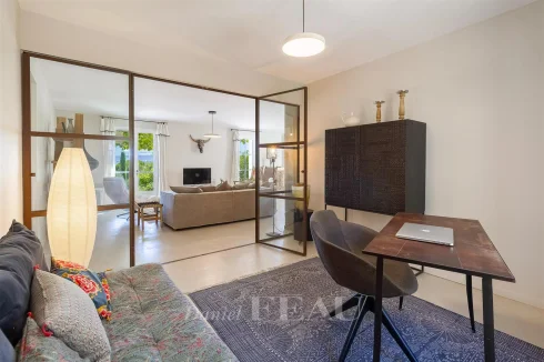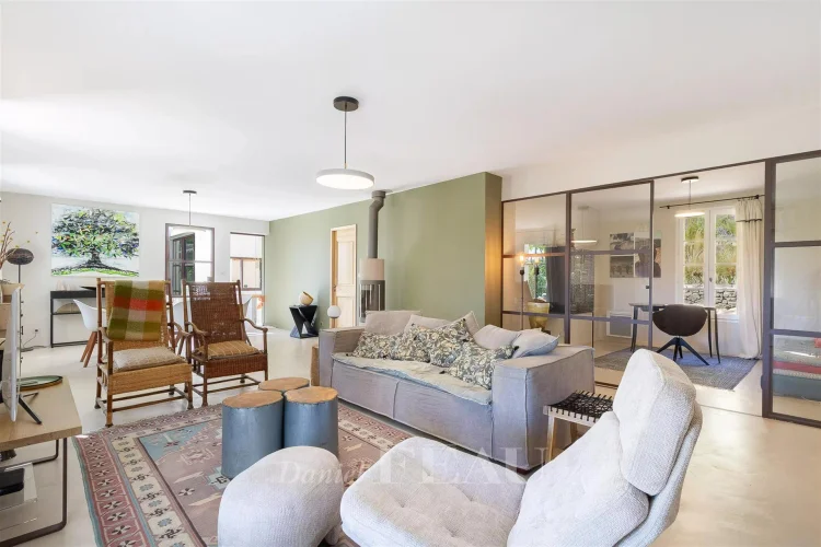 Renovated throughout and extended in 2022, it includes a spacious living/reception room bathed in sunshine and opening onto two terraces, a contemporary kitchen with an adjacent utility room, a study, and three bedrooms including a master suite with a shower room and a dressing room.