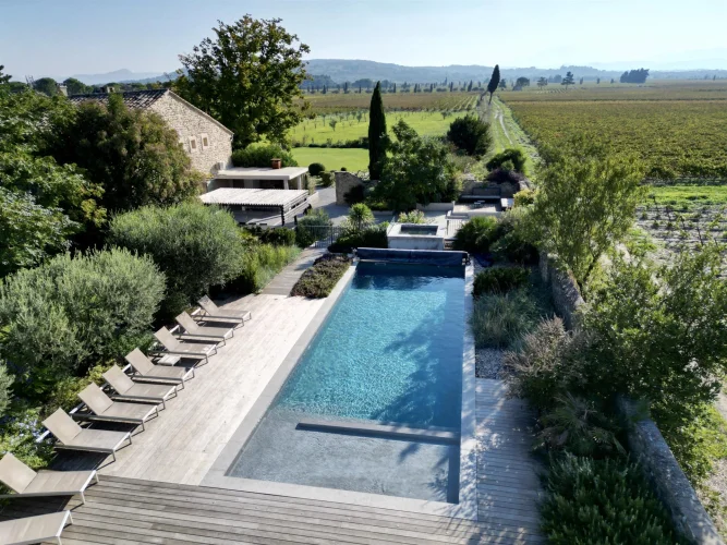 The bucolic exteriors offer a range of different atmospheres, with beautifully landscaped areas and extraordinary views from the Dentelles de Montmirail to Mont Ventoux.