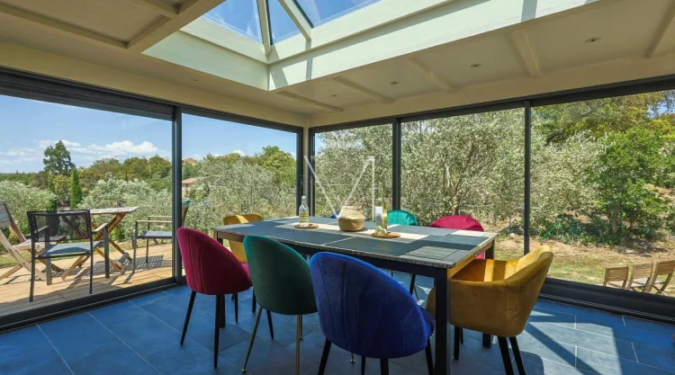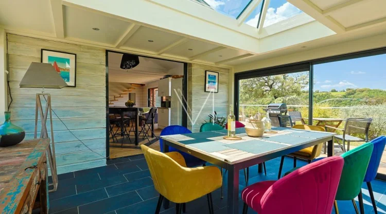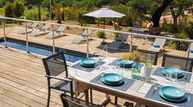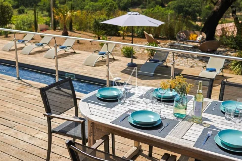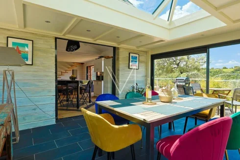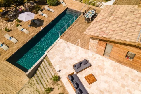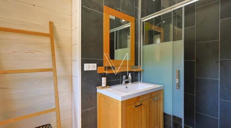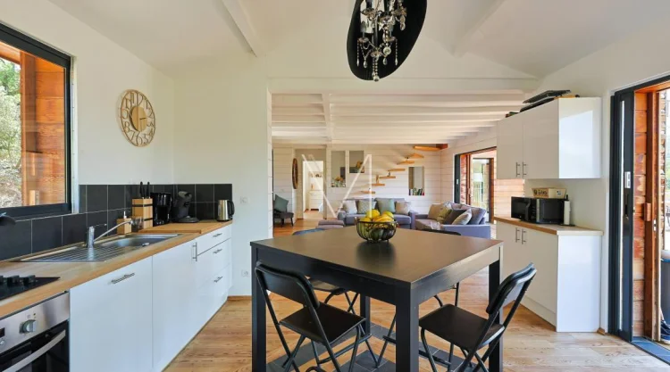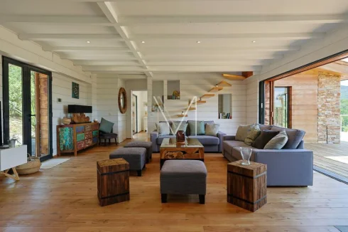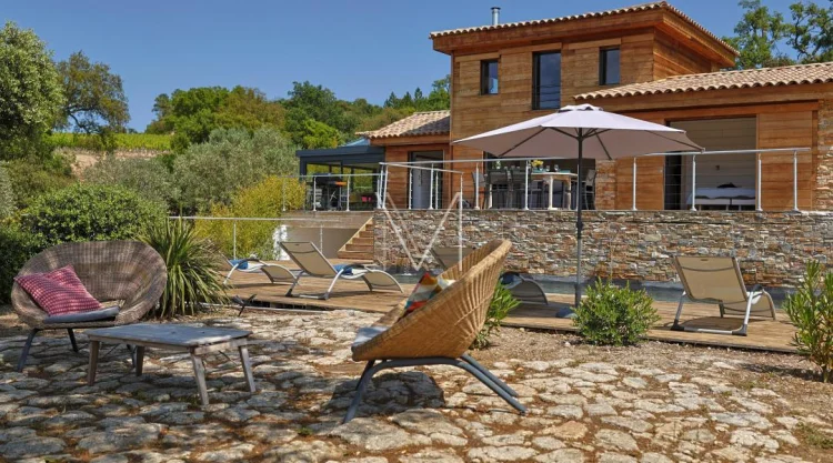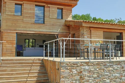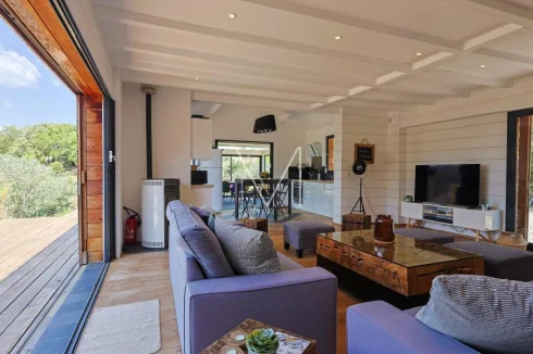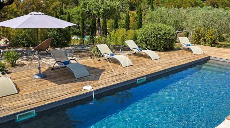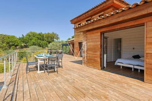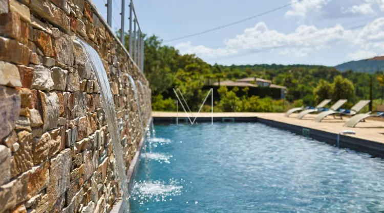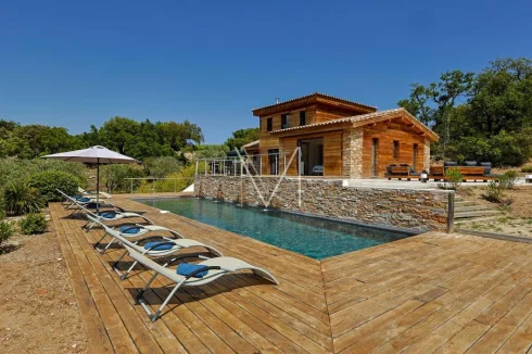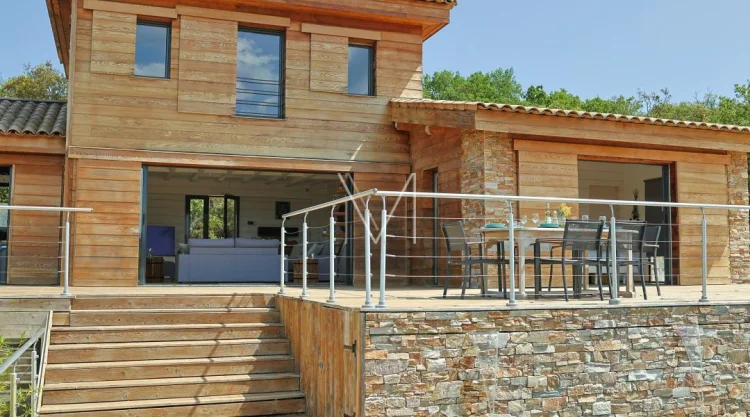 Exclusively, very beautiful wooden villa, in a calm and exotic environment on approximately 2671m2 of land. A living area of approximately 180 m2 facing the vineyards, in the heights of the village, located approximately 10 minutes by car from the center. Composed of a beautiful living room with pellet stove, American kitchen, veranda, two bedrooms with shower room and toilet on the same level, a master bedroom upstairs with dressing room, toilet and Italian shower, a bedroom on the pool level with dressing room, bathroom and toilet, a private storage room, a laundry room and an office. Beautiful swimming lane type swimming pool with waterfalls, travertine terraces, automatic watering, carport, exterior paving, camera, alarm. A real favorite, unusual and unique! Commercial agent registered with the Rsac of Frejus under number Information on the risks to which this property is exposed is available on the Géorisques website: