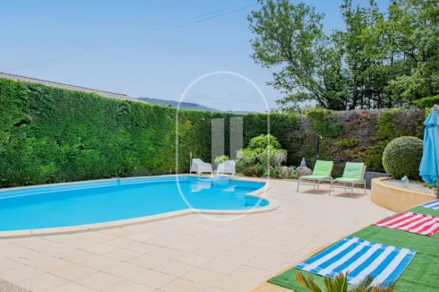 Upstairs, accessed by a handsome stone staircase, you'll find a bright and generous living space extended by a partially covered terrace with stunning views. The fully equipped kitchen integrates seamlessly, while three comfortable bedrooms, a fitted dressing room, a refined bathroom, and separate toilet facilities complete this level, all designed for effortless living. Outdoors, the landscaped garden strikes a harmonious balance between nature and thoughtful design: a traditional swimming pool bordered by wide stone-paved terraces, a garden chalet for bicycles, a pool house with toilet facilities, a separate garage for tools or motorbikes, and a discreet wood shelter.
