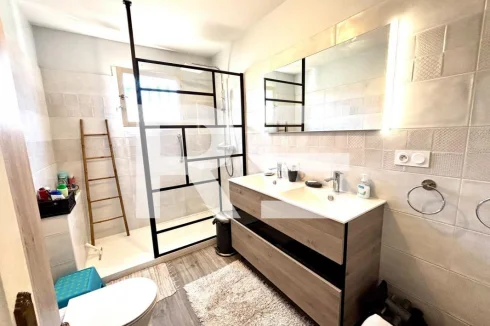On the ground floor, you will find a fitted and fully equipped kitchen, open to a large bright living room, with two large French windows giving access to the outside. Each room is equipped with double glazing and reversible air conditioning for optimal comfort in all seasons.