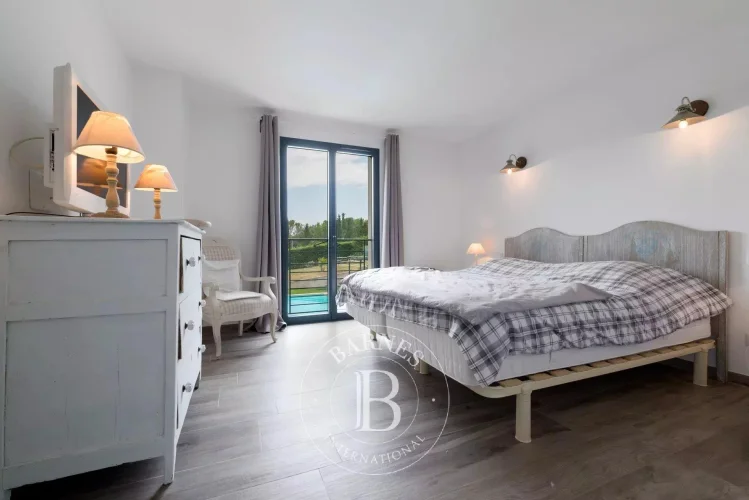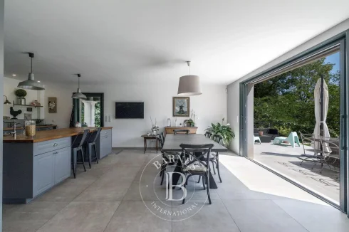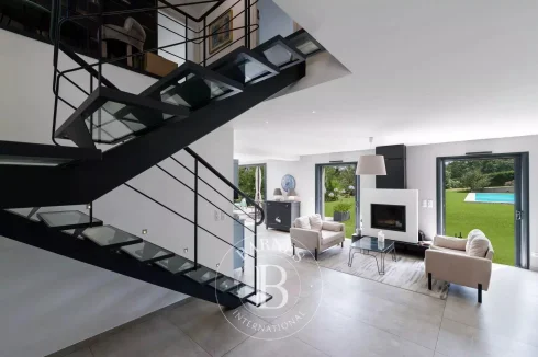 An entrance hall with cupboards and guest wc, a living room of around 100 sq.m bathed in light thanks to its many windows, a fully equipped kitchen opening onto a covered terrace, as well as a lounge/TV area with views over the swimming pool.