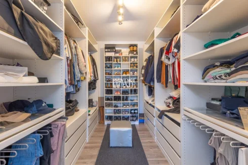 The single-storey dwelling of about 144 sqm is distinguished by its generous volumes and harmonious layout. From the entrance, a spacious 70 sqm living room with open kitchen and lounge opens onto the garden, with large bay windows bringing light in every season.