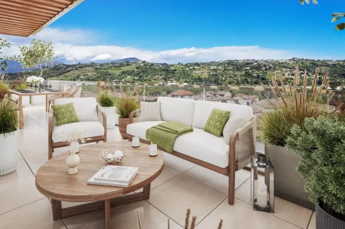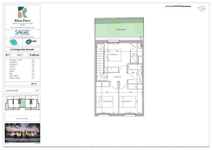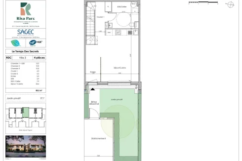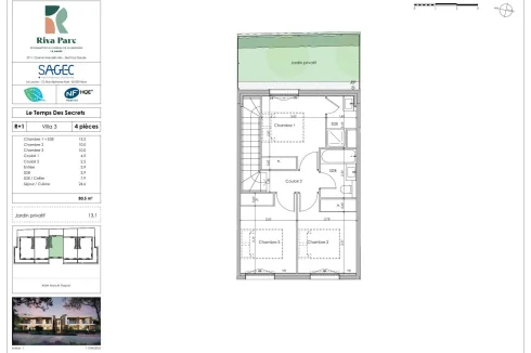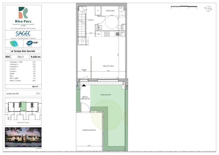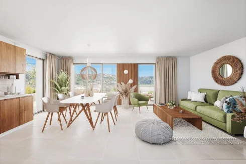 Magnificent 3-bedroom semi-attached villa with luxury features. Other lots and floor plans are available on request. La Gaude : Your unspoilt village at the heart of the dynamic Ecovallée. It was in the midst of the hills and fields of flowers of La Gaude that Marcel Pagnol settled in 1942 and developed a passion for growing carnations, the flower that would later inspire his masterpiece Jean de Florette. It is this typically Provençal setting that today attracts residents in search of authenticity and nature. The old village unfurls its historic facades in narrow streets dotted with a wash-house and fountains that lead to the Place du Marronnier or Place des Victoires, which hosts numerous events, and La Coupole, a cultural centre and cinema. The municipality has introduced an ambitious policy for environmentally-friendly travel, installing 5 self-service bicycle stations, while the Métropole bus network will take you to Nice or Saint-Laurent-du-Var. La Gaude is also strategically located to enjoy the whole of the Côte d'Azur, from the ski resorts of the Mercantour to the beaches of the Baie des Anges, from the Italian border to the red rocks of Théoule-sur-Mer. The promise of a natural, friendly and authentic lifestyle. Set on a vast, gently sloping plot, the 4 human-scale buildings blend discreetly into their wooded surroundings. Each building is different, with refined contemporary architecture featuring noble materials such as stone for authentic elegance, glass for light and wood for a natural touch, creating a perfect harmony. In keeping with the leading environmental approach adopted by the Hameau de La Baronne eco-neighbourhood, Riva Parc features a natural inner courtyard. Carefully landscaped, this pleasant green setting is in keeping with the heritage of the site and its wooded surroundings. It is planted with tall trees and a variety of fragrant, colourful local perennials. In this haven of peace, along the footpaths, you'll find shady squares with benches. There's plenty of space for children to play, relax, read and socialise. Your daily source of well-being, whatever the season. The architecture of the buildings captivates the eye with its contemporary inspiration, at once bold yet delicate. The stone base provides an elegant foundation for timeless sobriety. The facades are finished in cream and taupe, with wooden shutters and sunbreakers adding a harmonious natural touch. The residence gives pride of place to your exteriors, with private gardens planted with trees or deep terraces where you can enjoy the mild Côte d'Azur climate. Depending on the orientation of the upper floors, you can enjoy open, green views of the Bellet hills to the east, the Var plain to the south and the majestic Mercantour massif to the north.