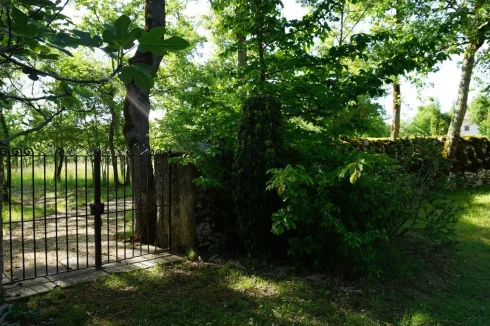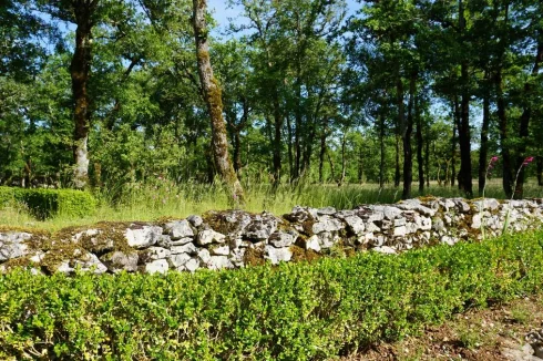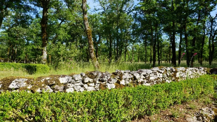 The property has a green and flowery garden with traditional dry stone walls and local trees.