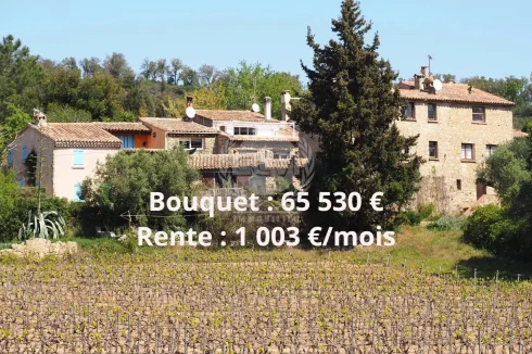 Sale in occupied life annuity with annuity and lump sum of this charming stone house located in an adorable hamlet just 10 minutes from the village. It features an entrance leading to pleasant living and dining areas, as well as an equipped open kitchen, all opening onto a beautiful terrace with views of the hills. On the lower level, there is a bedroom with an adjoining shower room, as well as a large bedroom also with its own shower room. Finally, on the garden level, you will find a garage and a cellar. The house is in good condition. Free value of the property is €400,000. Calculations based on a 70-year-old man. Lump sum of €65,530 including agency fees, monthly life annuity of €1,003.