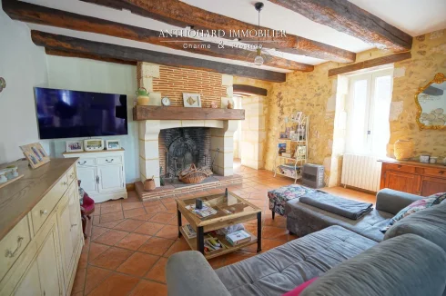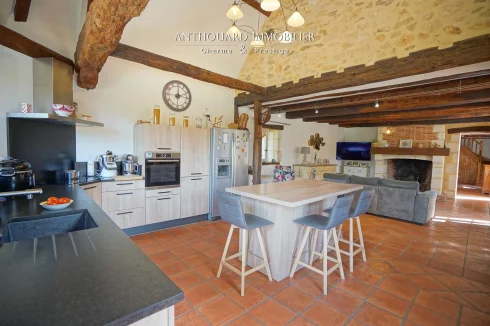 Large living room with fireplace and beautiful fitted kitchen, opening onto the terrace.