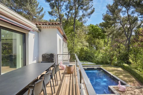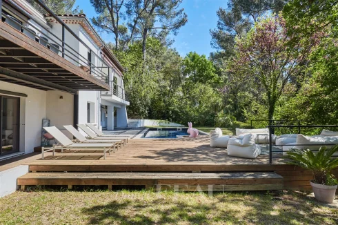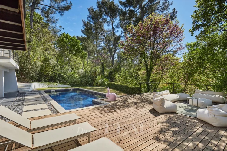 This elegant mid 20th century property set in 1200 sqm of leafy grounds in a peaceful and sought-after neighbourhood under 10 minutes from the town centre.