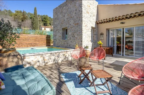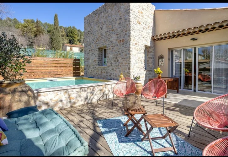 This villa built in 2021, offers an ideal living environment! Quiet, swimming pool, 2 steps from shops and school... A few steps to climb to access the house, which has a beautiful living room with bay window overlooking the terrace and the swimming pool, fully equipped open kitchen, 2 bedrooms, a bathroom with bathtub, separate toilet, and a master suite with its shower. This villa also benefits not only from modern comfort (roof and wall insulation, double glazing with mosquito nets, reversible air conditioning (ducted), thermodynamic tank, fiber for internet), but also from a basement of more than 50 m² and a very well equipped garage (hot and cold water, double glazing, ...) No work to be done, just enjoy the place in peace! To be discovered quickly.
