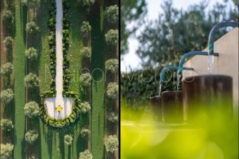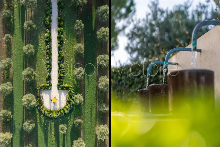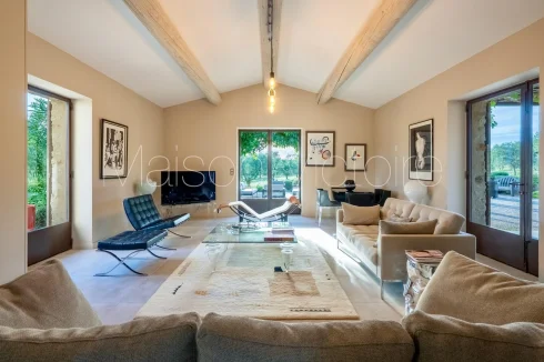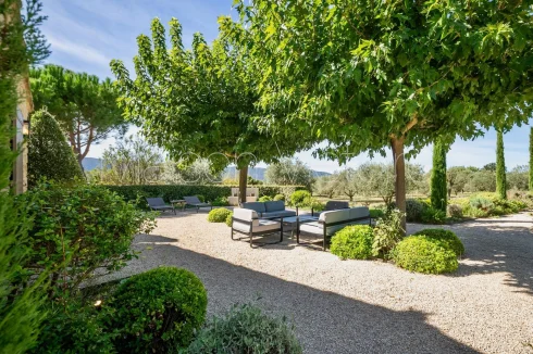 The landscaped grounds are beautifully designed, with flowering plants and manicured shrubs ensuring both privacy and colour throughout the year. A variety of terraces encompass the farmhouse, providing different areas for entertaining family and friends. The main living spaces open directly onto a dining terrace shaded by a pergola and overlooking the gardens. A cypress-lined avenue leads to a west-facing seating area, perfectly positioned to enjoy sunsets among the olive trees. To the east, a charming courtyard shaded by two plane trees and planted with boxwood and flowering shrubs creates a picturesque Provençal setting.