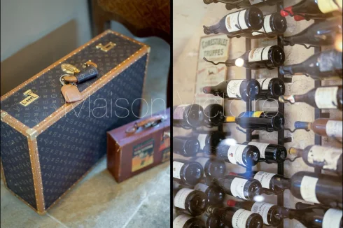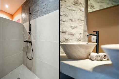 The accommodation begins with a welcoming open-plan living space, where a striking floating stone staircase and a glass-walled wine cellar set the tone. This great room comprises: bespoke contemporary kitchen by Fabre with black quartz countertops sun-drenched sitting room benefitting from triple-aspect French windows framing views over the countryside towards the Luberon generous dining area. The ground floor also includes a principal suite with adjoining shower room and fitted cupboards. Floors throughout are laid in beautiful Jerusalem stone.