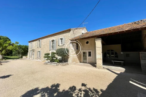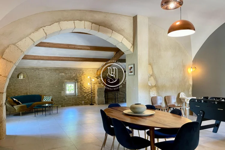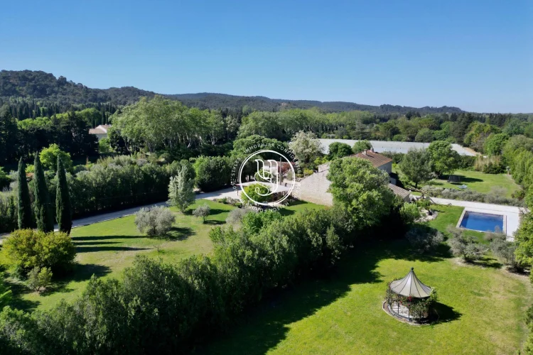 Styles private collection - A little paradise in Provence: Authentic 18th century farmhouse at the gates of Saint-Rémy-de-Provence. As soon as you pass through the gate, you will be immediately charmed by this stone building of over 465 m², nestled in an enchanting, magnificently wooded 1.5 hectare garden. The main farmhouse has been tastefully renovated, preserving the charm and character of this Provençal family home. The old materials (beams, stone walls, cement tiles, terracotta floor tiles) tell a part of the history of this typical old farmhouse. Facing due south, the light enhances the living spaces with their comfortable volumes and pleasant ceiling height. Inside, you will benefit from a fully equipped kitchen communicating with the spacious dining room, several living rooms with fireplaces, 8 bedrooms, 4 shower rooms and 2 bathrooms. Just a short walk away, located on the property, a completely independent 28 m² mazet allows you to welcome your guests. They will enjoy a kitchen area open to the living room as well as a bedroom and a bathroom. Regarding the exterior, a relaxing atmosphere with a green oasis including a pleasant 13m x 6m swimming pool, a pétanque court to enjoy the incomparable rays of the Alpilles sunshine and thus live at the local pace. A rare find, your Provençal dream awaits. This property has everything you need for a family home or a bed and breakfast. A unique, superb location, available exclusively at Style S. Dpe mazet: 190 kWh/m2/year and 5 kg CO2/m2/year